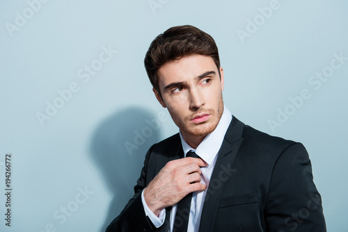 Close up portrait of handsome cool posh attractive confident serious with modern hairdo employee touching correcting tie with hand isolated on gray background copy-space