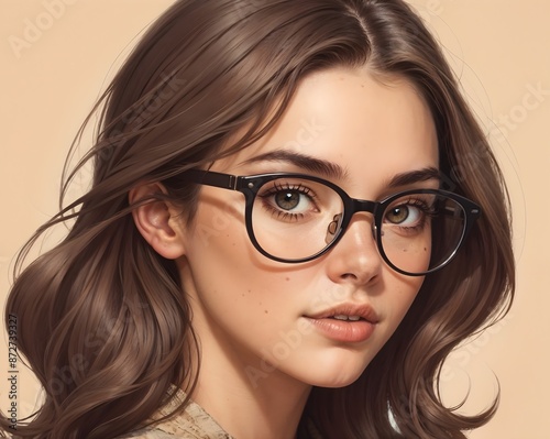 Close up portrait of pretty young woman with glasses against beige background. Female fashion model posing with sunglasses.
