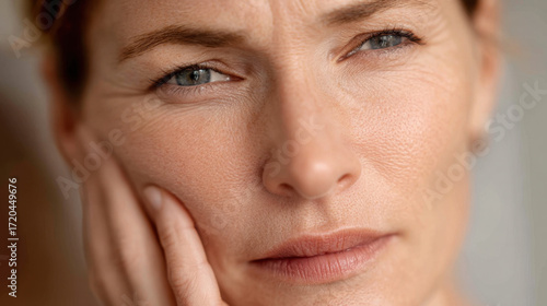 Close up portrait of thoughtful woman with blue eyes and light brown hair, expressing contemplation and introspection. soft lighting highlights her facial features and natural beauty