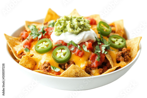 Close up shot of a bowl of nachos with various toppings including cheese, jalapenos and guacamole. Isolated on transparent background
