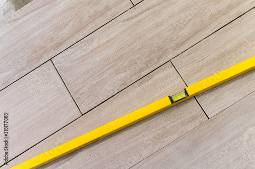 Close up shot of a metal yellow spirit level placed on a newly installed yet not finished kitchen tiles