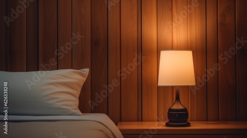 Close up shot of a night lamp next to a hotel bed, against wooden wall, clean minimalist, bright warm light.
