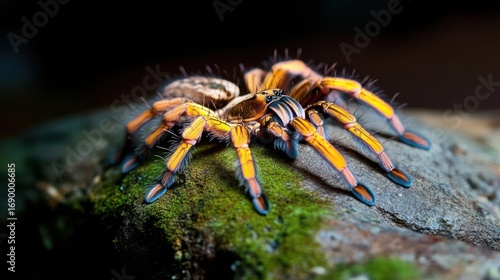 Close up shot of a vibrant orange and brown spider on a mossy stone surface