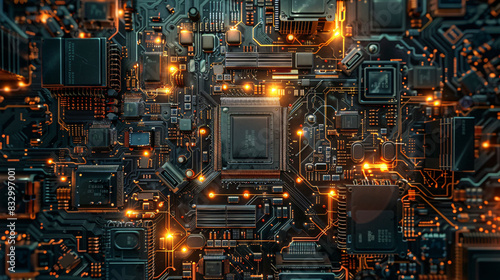 Close Up Shot of Processor Chip Computer Circuit Board with Orange Light