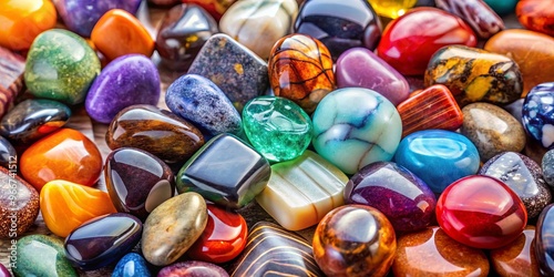 Close up shot of vibrant polished stones in various shapes and colors arranged on a flat surface, showcasing the beauty of geology and collection