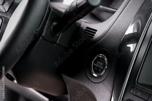 close up start stop button and windscreen wiper switch inside a new car