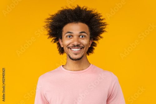 Close up studio portrait of young attractive African American man in basic pastel pink t-shirt posing over yellow background
