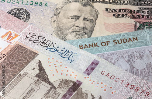 Close up to 100 Sudanese pounds of the Republic Sudan beside US dollars banknotes. 100 Pound banknotes of the African country Sudan. Money US with sudanese banknote. World currency. Hundred Pound