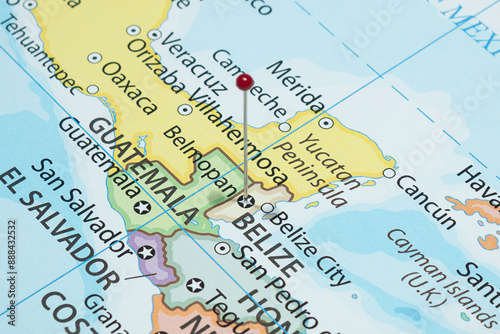 Close up to a Belmopan city with a red pin needle into Jamaica country political map