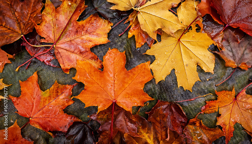 close up top view of wet fallen colourful maple leaves lying on ground in a rainy day orange autumn textured background copy space beauty in nature theme