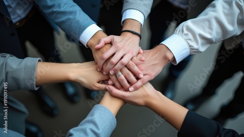 Close Up Top View of Young Business People Stacking Hands in Unity