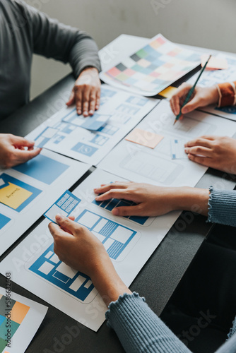 Close up ux developer and ui designer brainstorming about mobile app interface wireframe design on table with customer breif and color code at modern office.Creative digital development agency