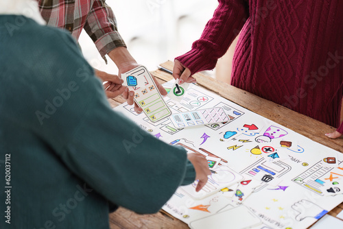 Close up ux developer and ui designer brainstorming interface wireframe design.Creative digital development agency