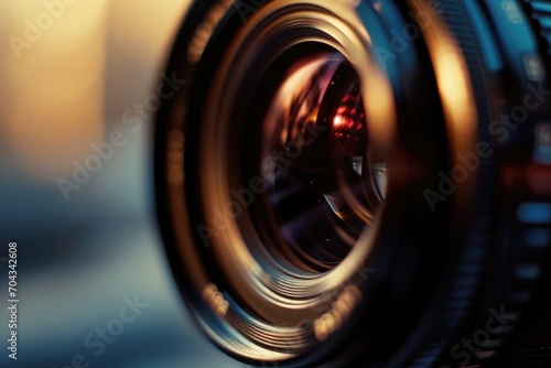 Close up view of a camera lens with a blurred background. Can be used to depict photography, technology, or creativity