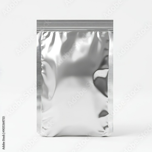 Close up view of a shiny silver foil pouch with a zipper on a white surface