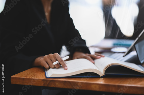 Close up view of businesswoman reading information on book and working with computer tablet at office desk.