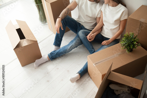 Close up view of happy couple sitting on the floor with cardboard boxes holding hands ready to relocate move in out house, young man and woman packed belongings on moving day settling in new own home