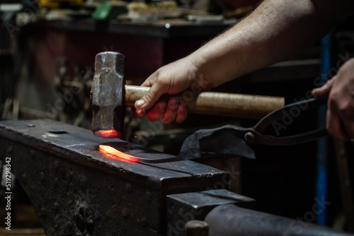 Close up view of heated metal and anvil. Blacksmith in the production process of other metal products handmade in the forge. Metalworker forging metal with a hammer into knife. Metal craft industry.