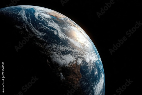 Close up view of planet earth from space showing continents and swirling clouds against a dark void