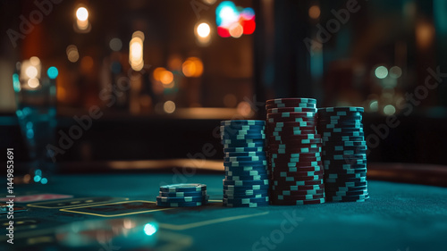 Close up view of poker table with casino chips and dramatic lighting in a high stakes card game scene