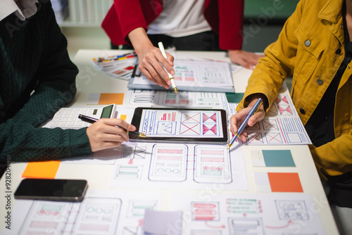 Close up view of UI developer team brainstorming on their project with laptop, smartphone and digital tablet.