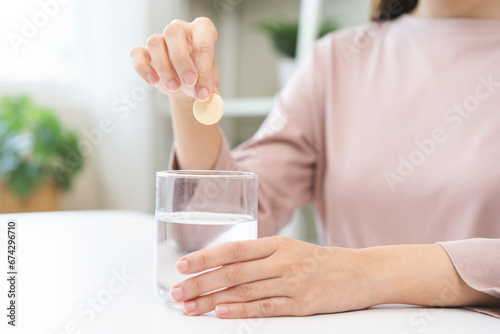 Close up young woman hand putting or dropping effervescent tablet into glass of water, holding pain pill, painkiller medicine, aspirin for treatment, take vitamin c for hangover. Health care concept.