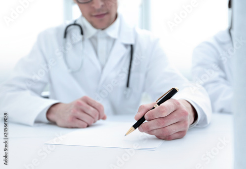 close up.the doctor makes a journal entry