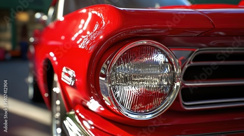 Close view of retro red car headlight with polished chrome and deep red paint