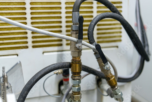 Close view of valves and hoses connected to cooling equipment in an industrial setting
