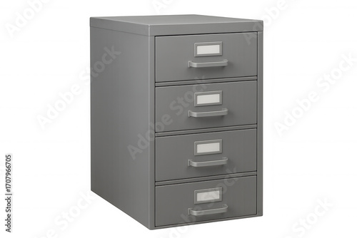 Closed gray metal filing cabinet with four drawers and blank labels, isolated on transparent background