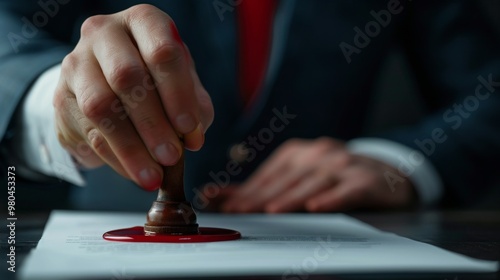 Closed up businessman hand using classic wax stamping to seal document concept, copy space.