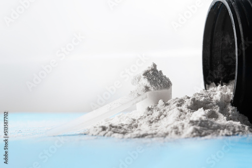 Closed up shot of a scoop of creatine powder next to a bottle.