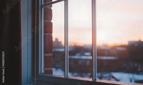 Closed window in a dimly lit room overlooking city buildings, Generative AI