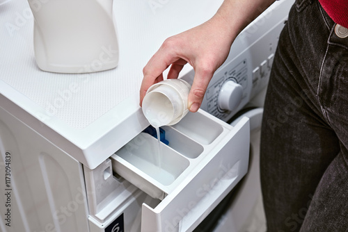 Close-up a young women pours liquid washing gel into container of a washing machine. Modern cleaning products for colored and white clothes.
