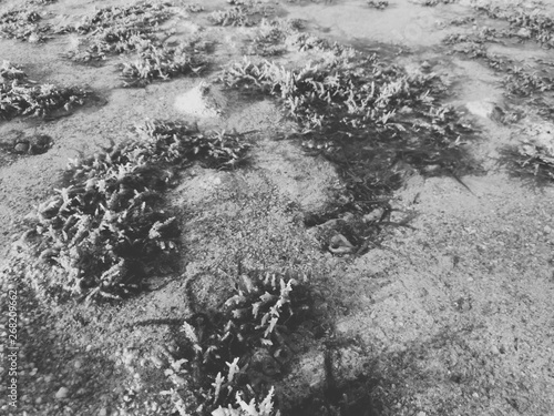 Closeup abstract black and white image of sea weeds and corals on the sea shore