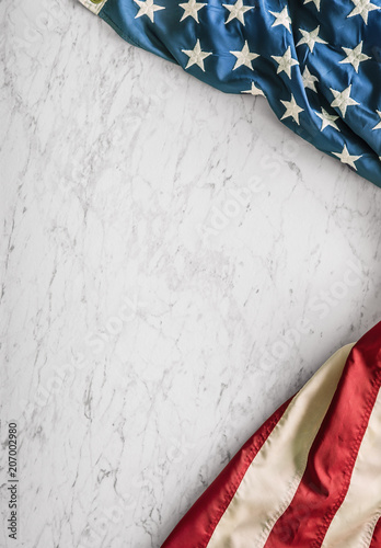 Close-up american flag on white marble background