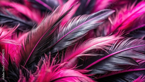 Close-up artistry: pink and black feather textures, high depth of field, fashion backdrop.