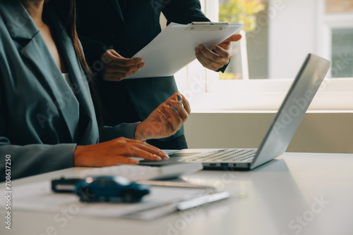 Closeup asian male people car salesman or sales manager offers to sell a car and explains and reads the terms of signing a car contract and insurance.