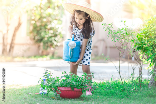 Close-up background view of a cute girl who is watering plants or growing vegetables for health,a crop cultivation program and business expansion