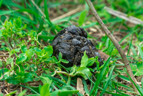 Close-up black color goat excrement. Faeces animal in the green grass. Hoofed mammals manure - livestock droppings. Organic fertilizer for the earth. Compost.