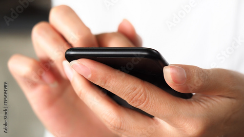 Closeup business woman hand using smartphone for connecting internet, communication technology concept background