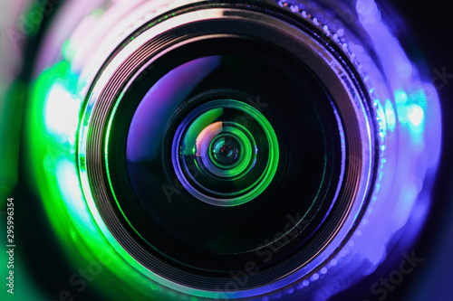 Close-up camera lens with green ans purple backlight. Optics. Gorizontal photo
