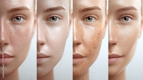 Close-up comparison of different skin types: dry, oily, porous, and combination. Detailed texture for dermatology, skincare, beauty treatments, and cosmetic product concepts.