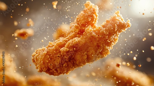 Close-up freeze-motion shot of fresh fried chicken strips in mid-air, with golden breading and crispy texture