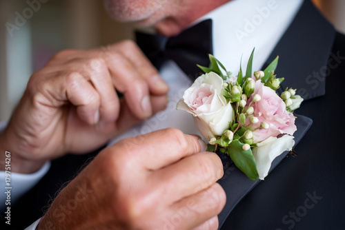 close-up groom fastening boutonniere, soft focus background, elegant details, no logo no text, DSLR 50mm f/2 ISO 300 natural light shallow depth of field