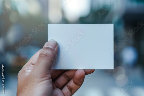 Close-up Hand Holding Blank Business Card on Blurred Background