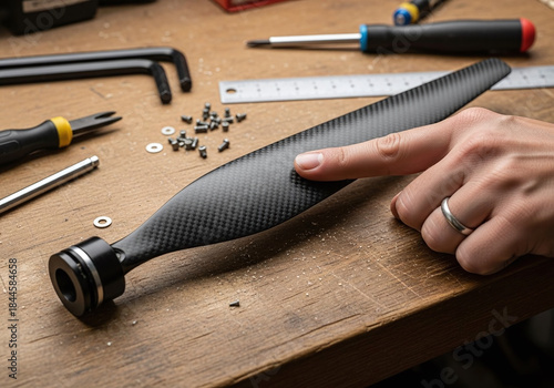 Close-Up Hand Touching Carbon Fiber Propeller Blade