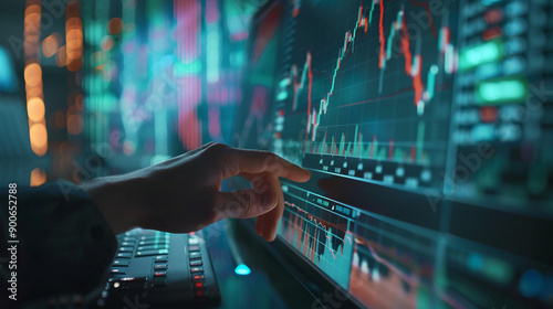 Closeup hand using computer analyzing stock market trends investment