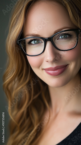 Closeup headshot of a smiling woman with long blonde wavy hair and blackframed glasses. She has blue eyes and a pleasant expression. Professional studio lighting enhances her features