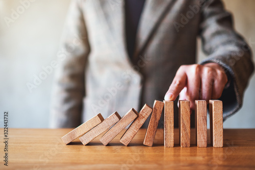 Closeup image of a businesswoman's finger try to stopping falling wooden dominoes blocks for business solution concept